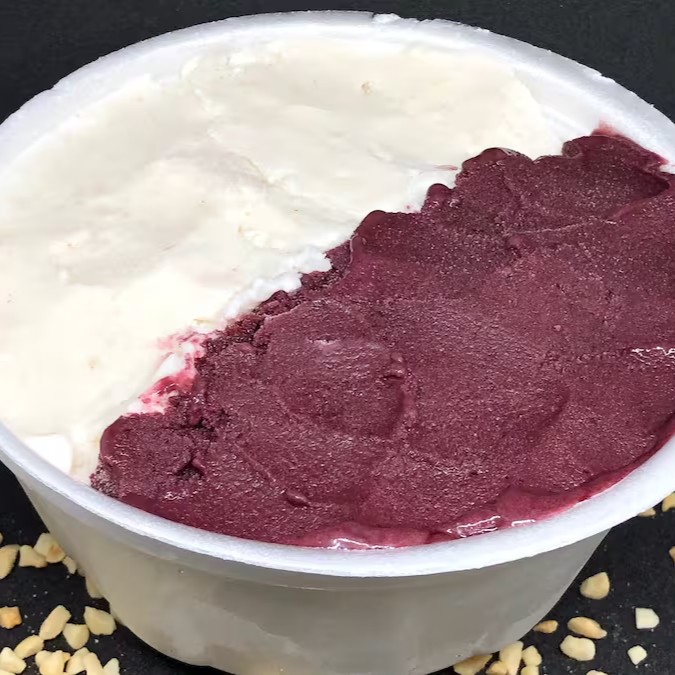Dentro do pote de isopor escolha Metade do copo de Açaí e a outra metade de creme da sua preferência. Os acompanhamentos são enviados separadamente.