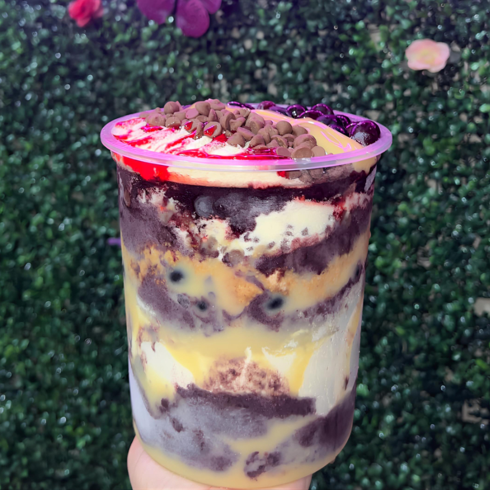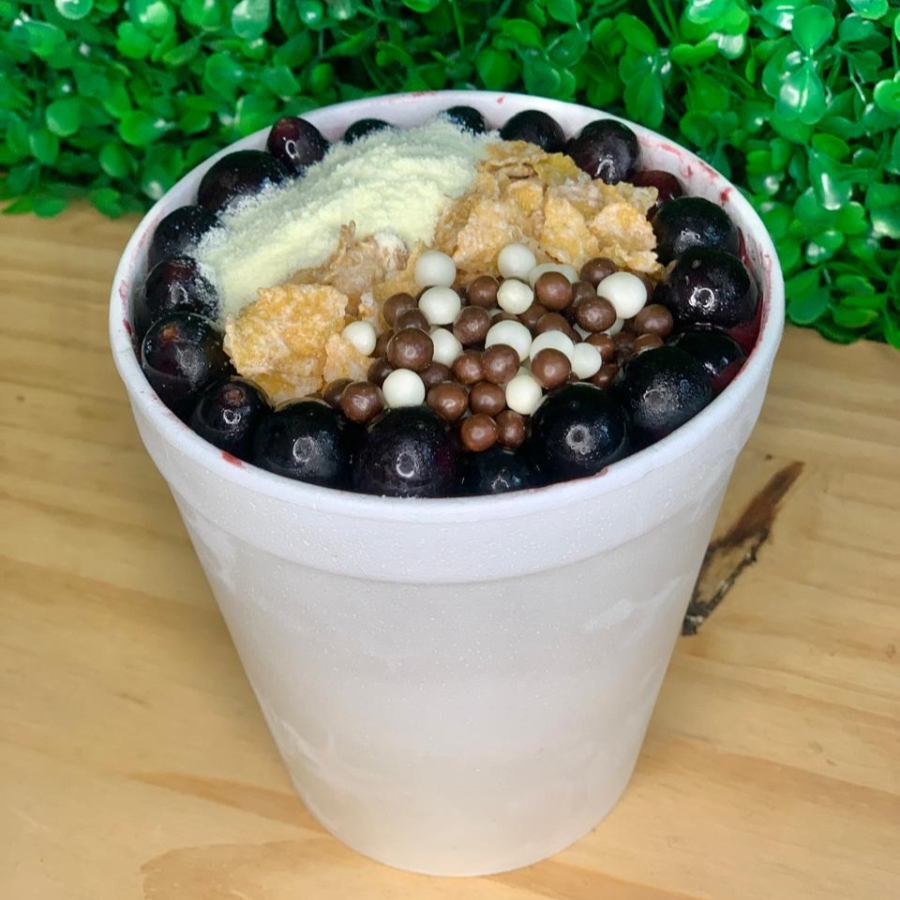 2 Copos térmicos de isopor de 720ml com Açai + 4 Acompanhamentos grátis da sua preferência em cada copo.