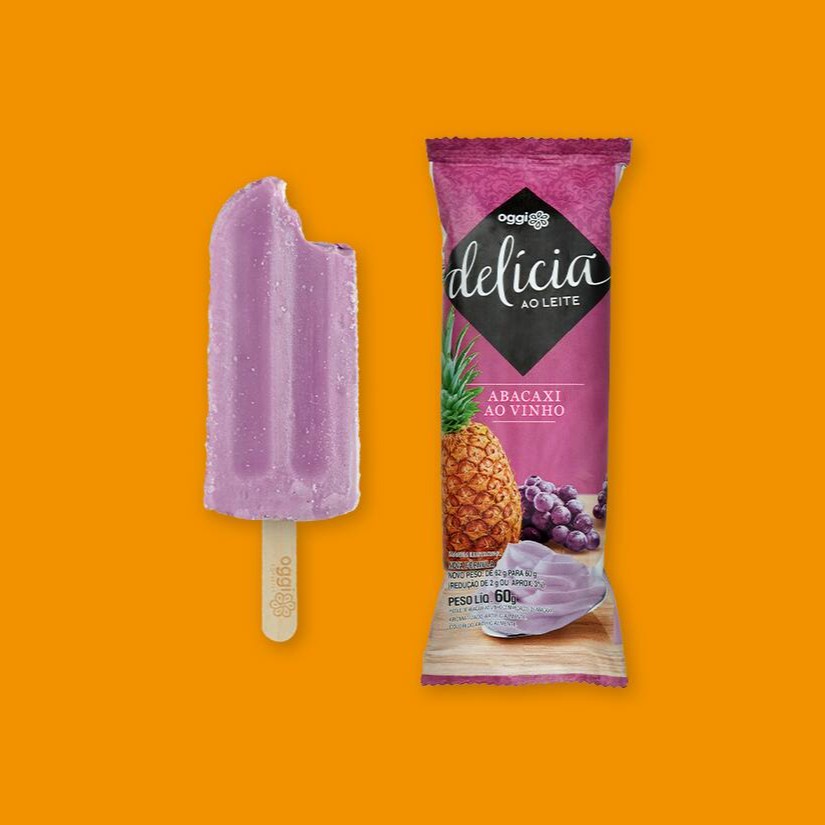 O tradicional bombom no palito. Picolé sabor baunilha com recheio sabor chocolate e cobertura sabor chocolate branco com crocante de amendoim.