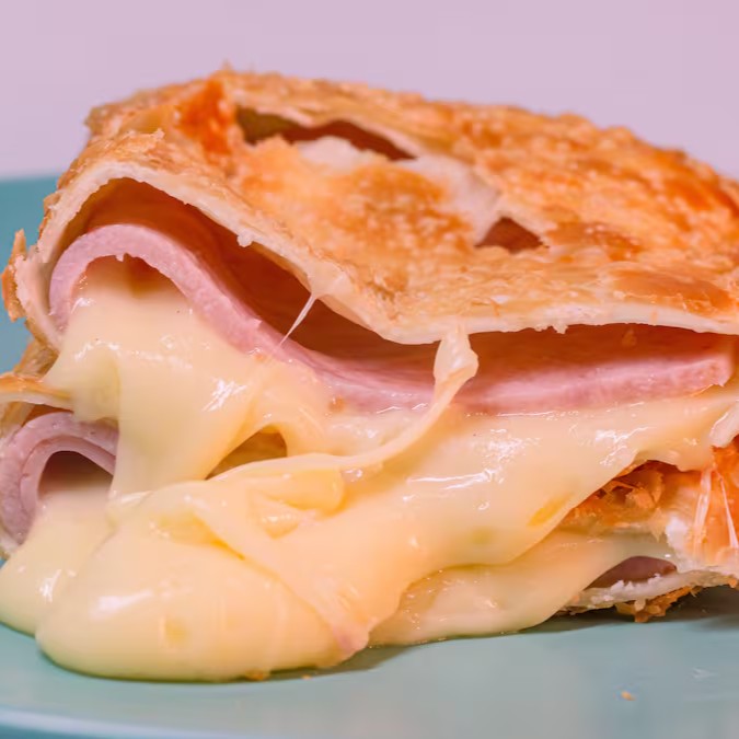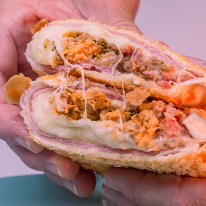 Frango desfiado e carne, fatias generosas de presunto, mussarela derretida, requeijão cremoso e calabresa.