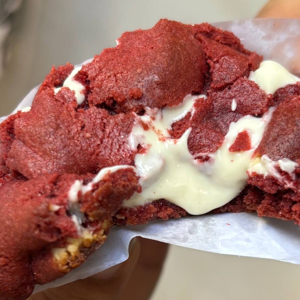 Cookie ousado com alma americana! O Gringo é feito com uma massa suave e aveludada de red velvet, com aquele tom vermelho intenso que já conquista pelos olhos. A textura é macia, quase como um bolo, mas com o toque marcante dos pedaços generosos de chocolate branco espalhados pela massa. No topo, um quadrado de chocolate branco nobre no estilo alto dá o toque final, criando uma explosão de sabor e contraste a cada mordida. É doce, elegante e cheio de atitude – impossível comer um só!