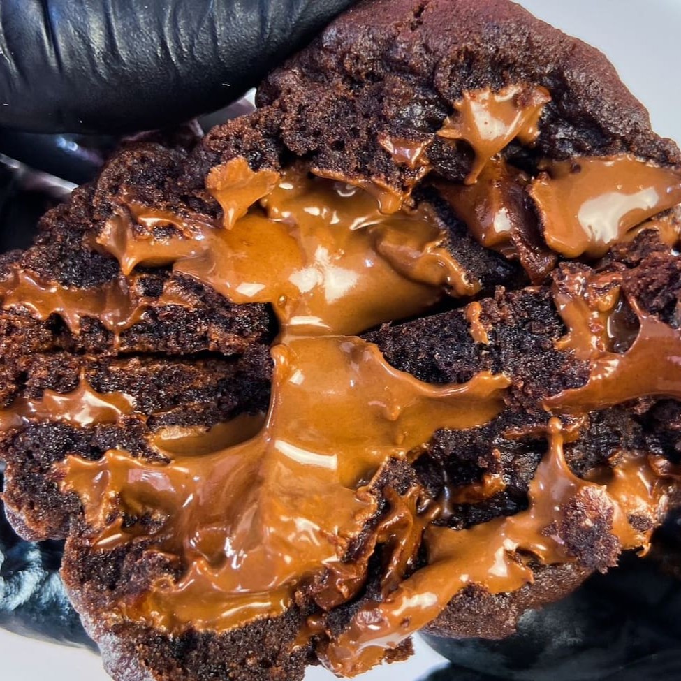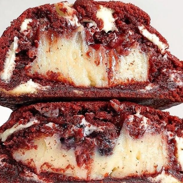 Cookie de cacau belga vermelho, pedaços de chocolate nobre branco, geleia de morango e recheio de brigadeiro de cream cheese super cremoso.