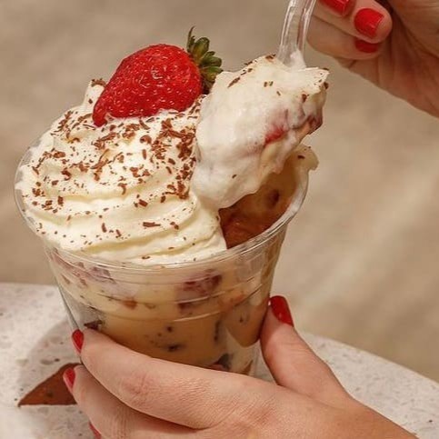 Brigadeiro, 02 bolas de gelato, pedaços de cookies triturados, creme de Ninho, morango e chantilly da casa. Montado em copo de isopor de 300 ml para garantir a temperatura!