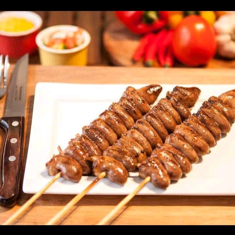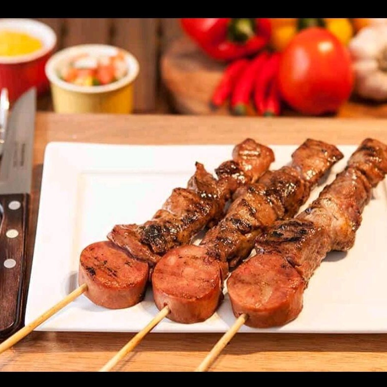 Espetinho de 110gr a 120gr de Toscana, Filé de Frango e Contra Filé.