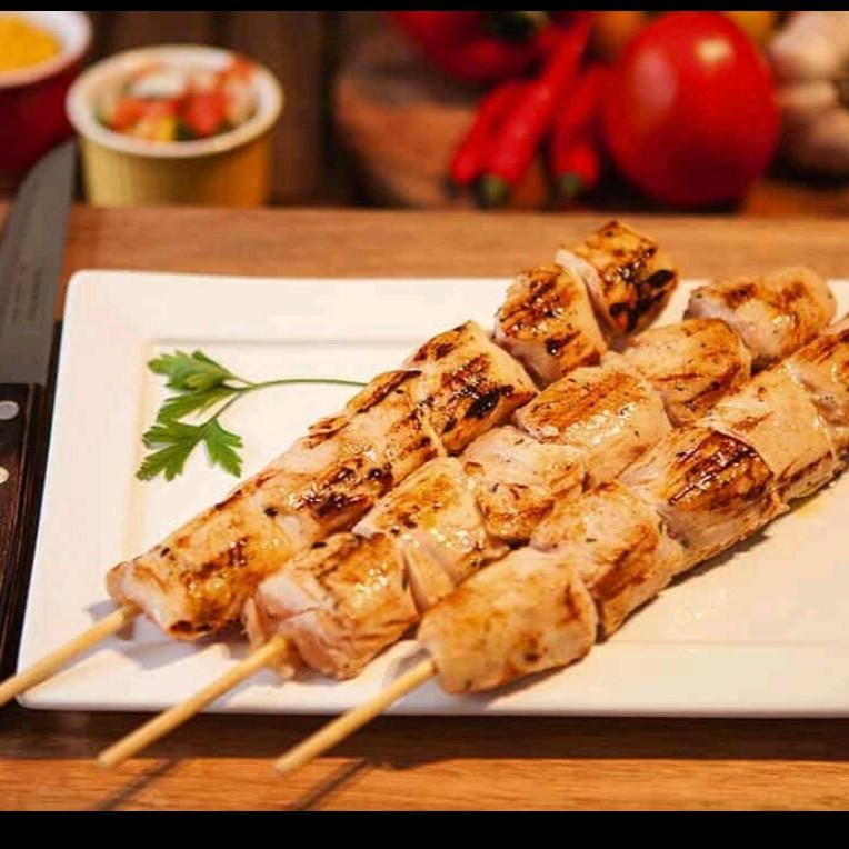 Espetinho de 110gr a 120gr de filé de Frango.