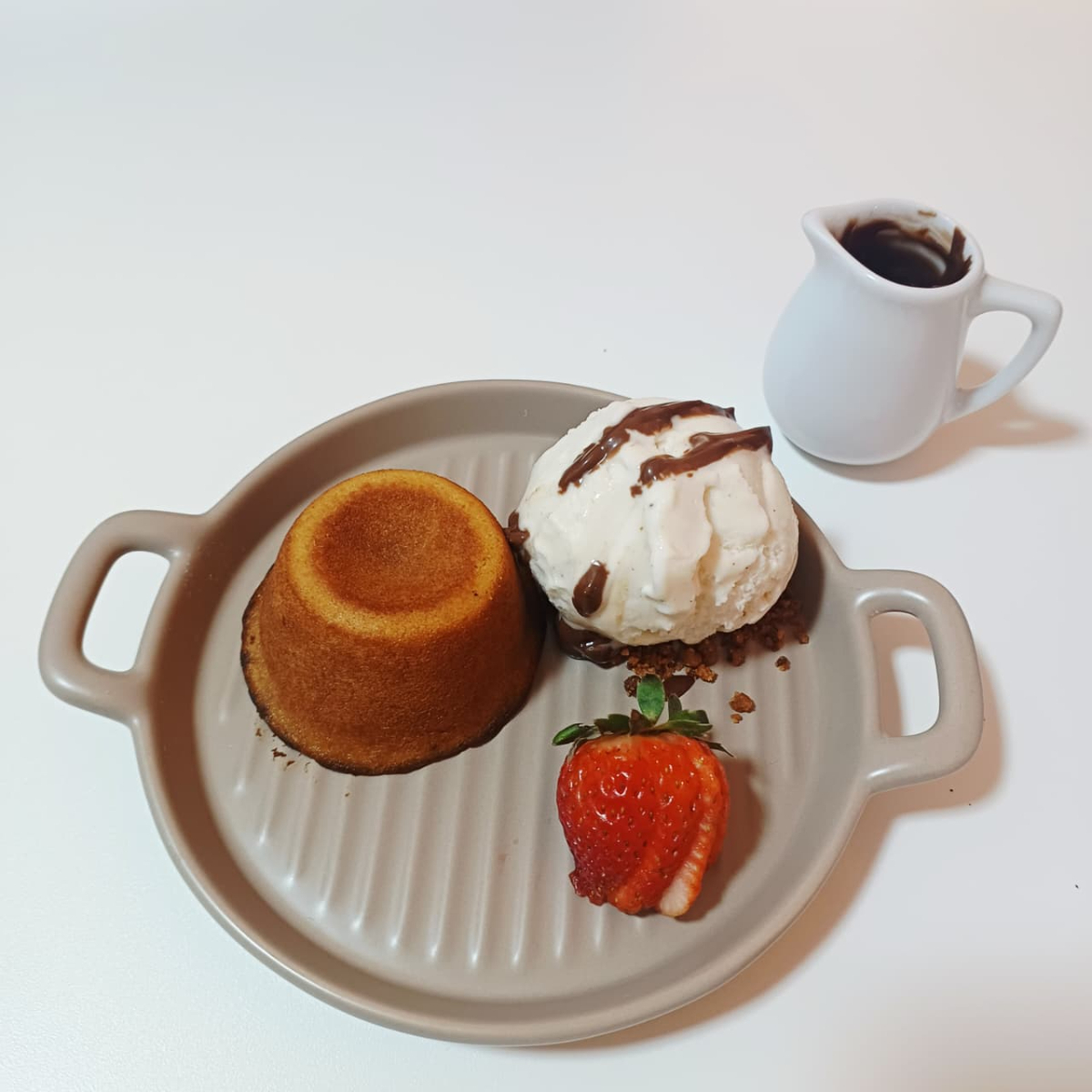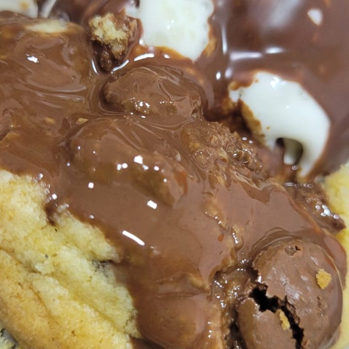 Cookie artesanal, produzido com chocolate nobre, acompanhado de 01 bola de gelato e calda quente de chocolate