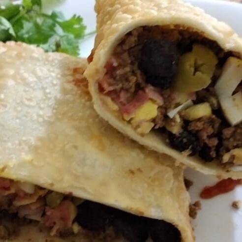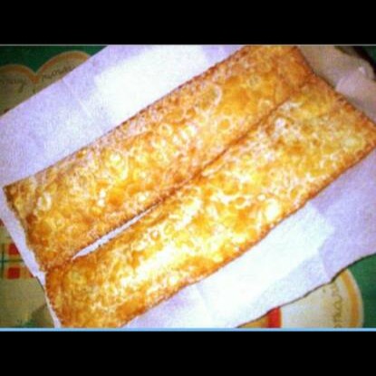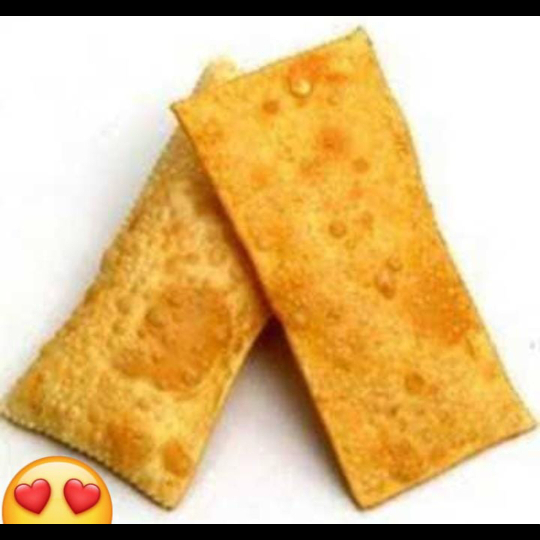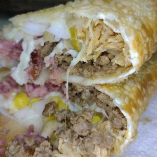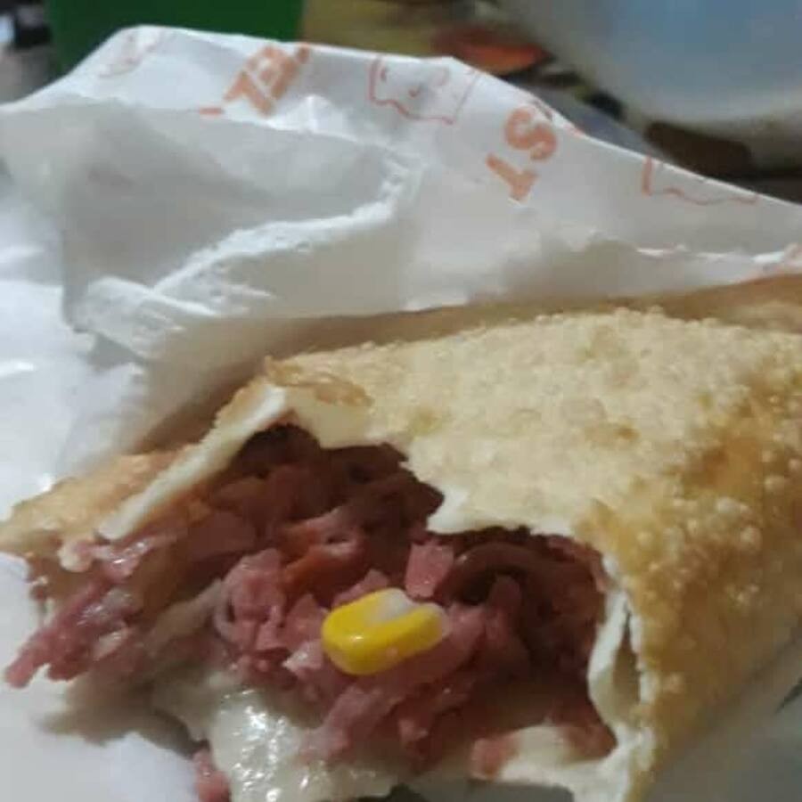 Pastel crocante e sequinho com recheio de carne moída, queijo mussarela, Azeitonas e uvas passas