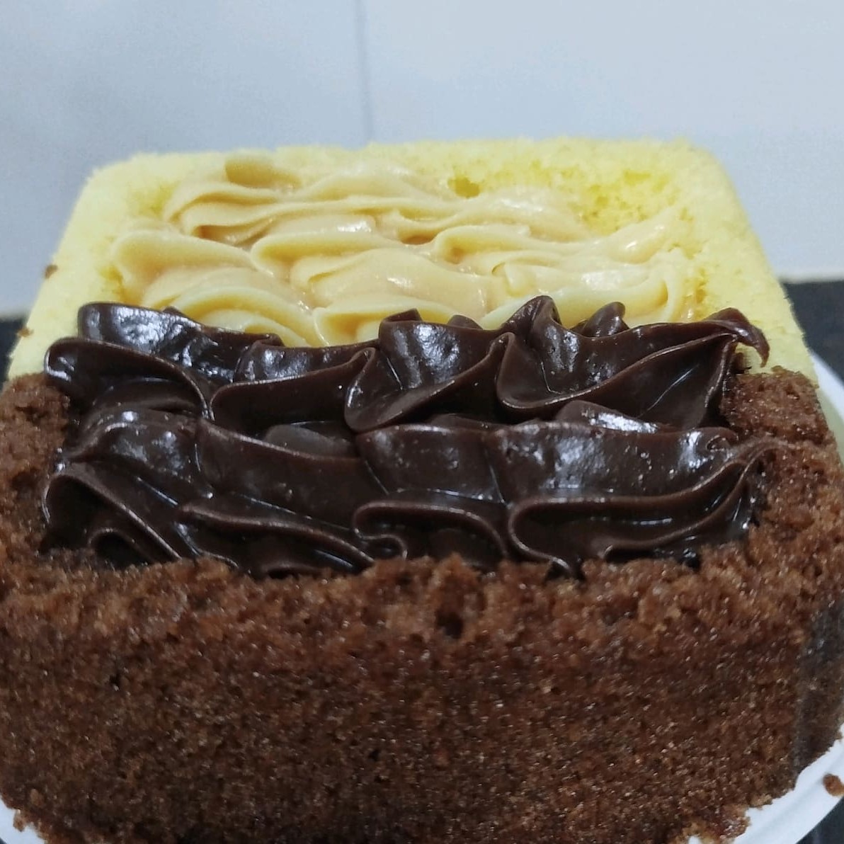 Tem Bolo de massa mesclado, chocolate e branco