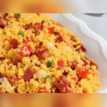 Cuscuz, bacon, calabresa, tomate e cheiro verde