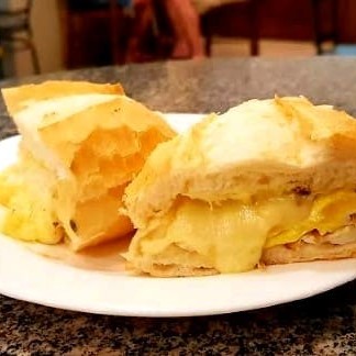 Pão boladão, manteiga, ovo, queijo, presunto e salada.