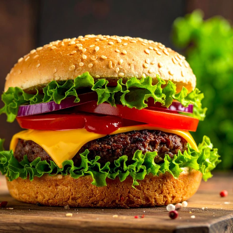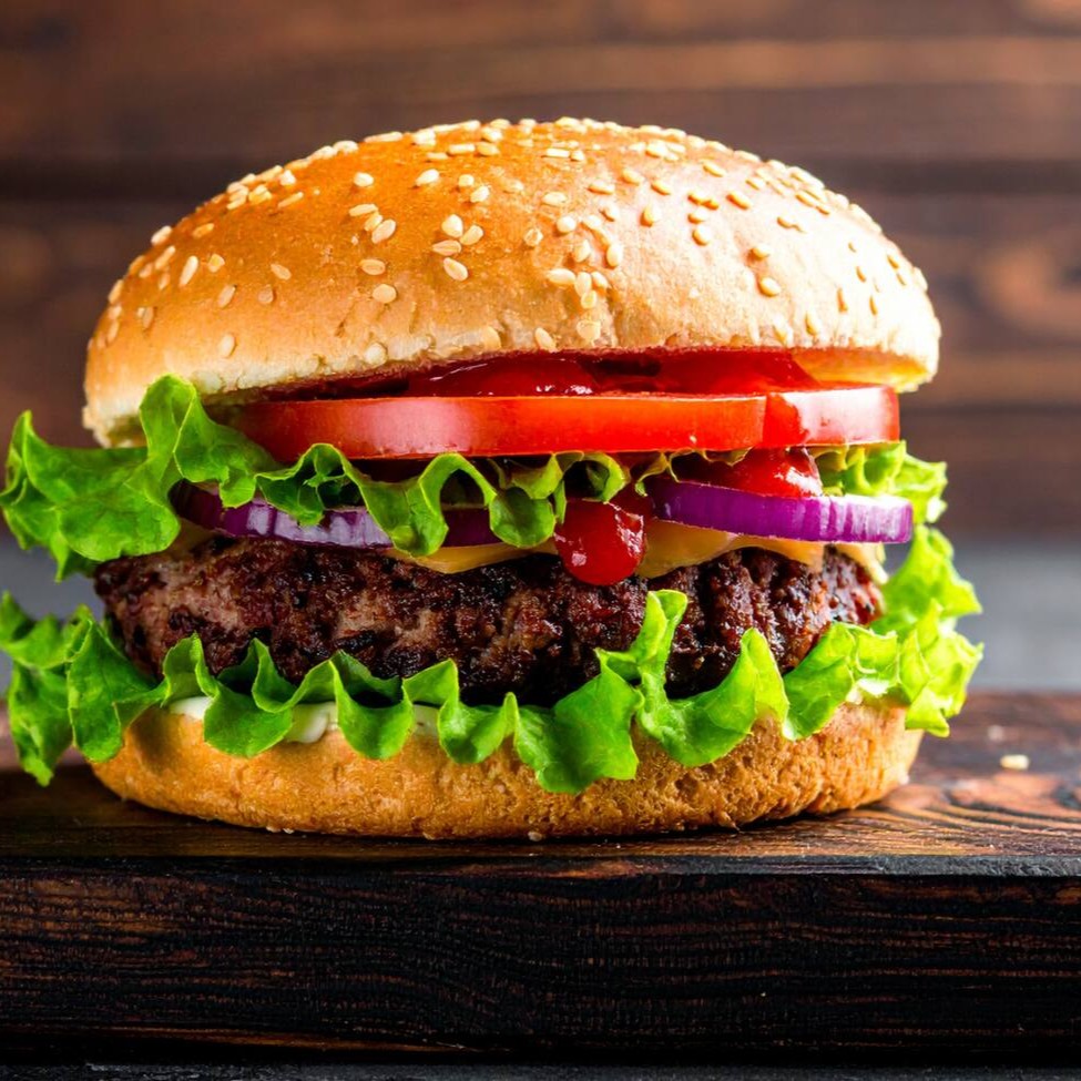 Pão de Hambúrguer, Carne de hamburguer 110g, Alface e Tomate.