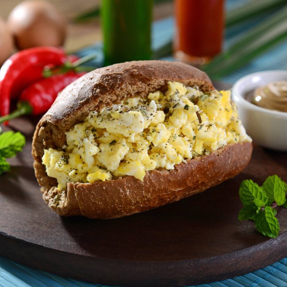 Pãozinho levemente tostado com ovo frito ou mexido, como preferir. Comece seu Dia com muita energia!