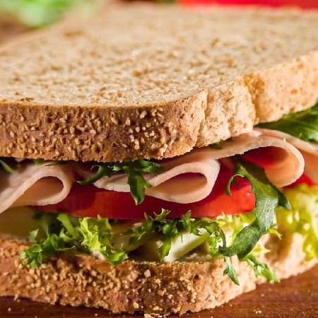 Um sanduba leve e nutritivo, preparado com pão de forma integral e recheado com requeijão cremoso, duas fatias de queijo branco, alface fresco e peito de peru fatiado.