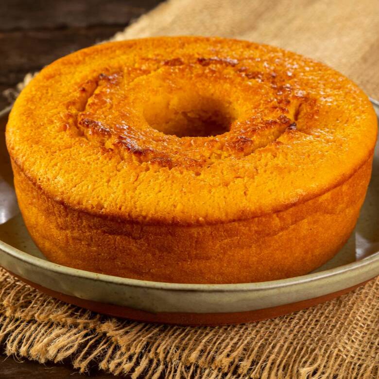 Bolo caseiro de aipim, macio e bem úmido, preparado com ingredientes selecionados que realçam o sabor tradicional. Finalizado com uma generosa calda caramelizada que traz um toque dourado.