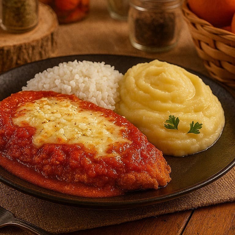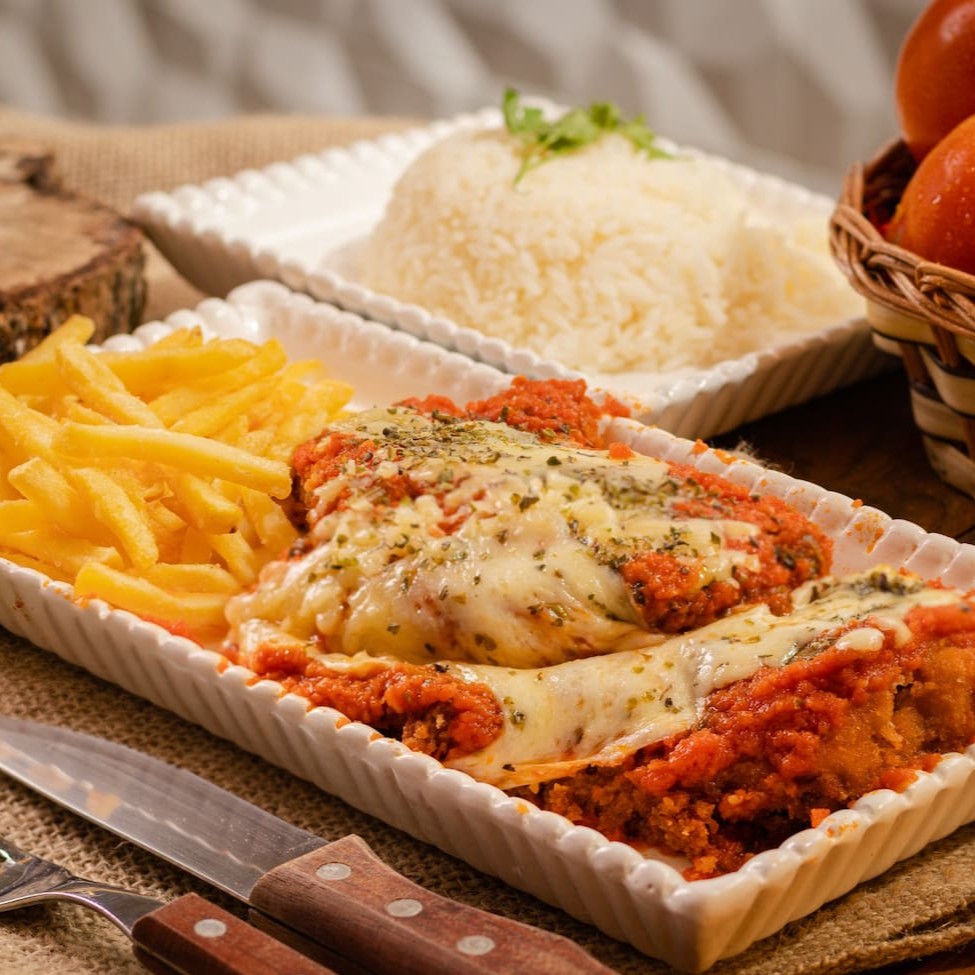 Uma deliciosa fusão suculenta de carne ( patinho) empanada em panko, coberta por um molho de tomate caseiro e queijo derretido. Uma experiência crocante e deliciosa!