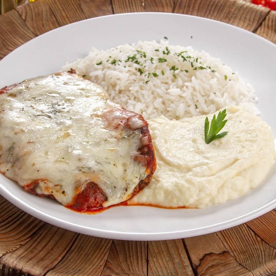 Delicioso Tilapia crocante empanado na farinha panko, coberto com molho de tomate caseiro e queijo gorgonzola derretido. Acompanha arroz branco soltinho e purê de batata inglesa. Uma explosão de sabores em cada garfada.