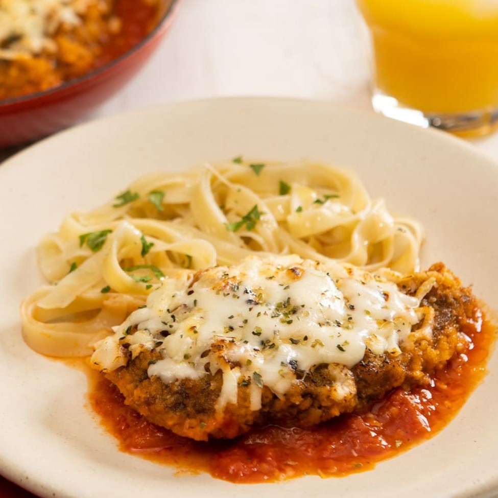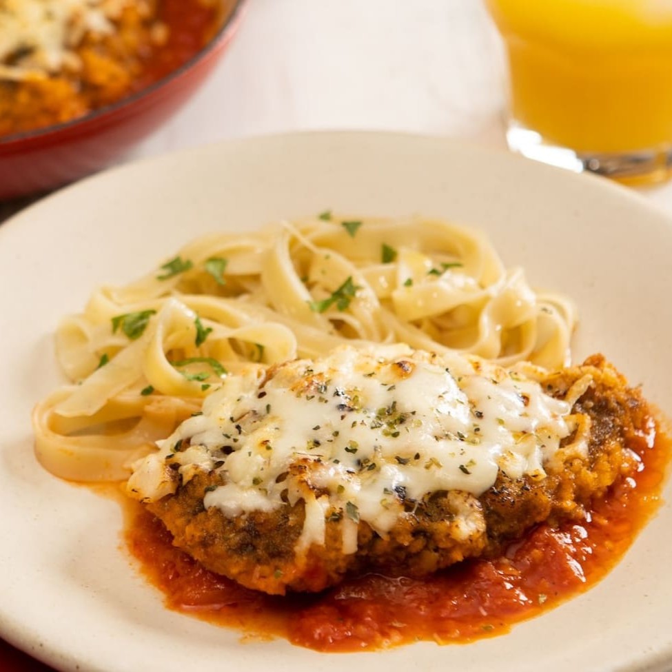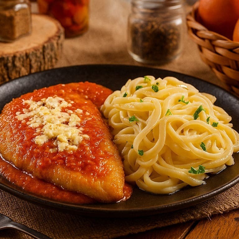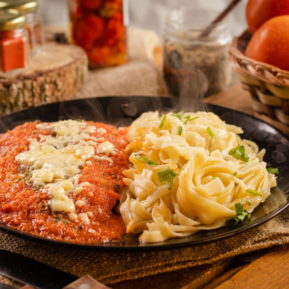 Delicioso frango empanado com farinha de panko, coberto com molho de tomates e muçarela acompanhado com um delicioso talharim refogado na manteiga com alho frito.