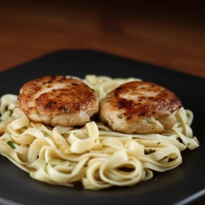 Macio e delicioso hamburguer de frango artesanal com talharim refogado no alho frito. Uma delicia!