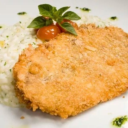 Uma deliciosa fusão suculenta de carne ( Filé) empanada em panko, coberta por um molho de tomate caseiro e queijo derretido. Acompanhado de um tatlharim refogado no alho e oleo. Uma experiência crocante e deliciosa!