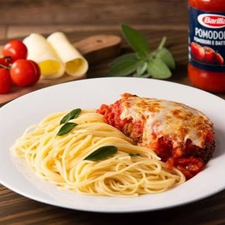 Molho de tomate artesanal, molho branco,queijo e presunto finalizando com parmesão.