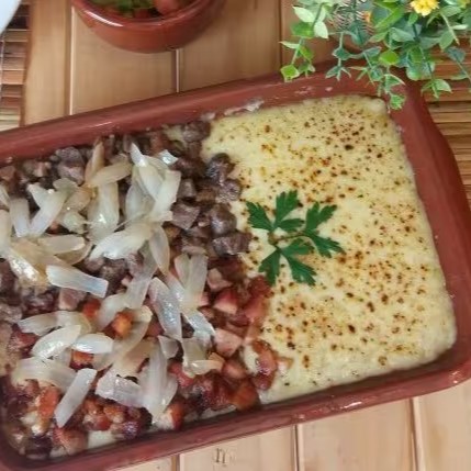 Pirão de aipim artesanal, cremoso e saboroso, servido com a proteína e opções de acompanhamentos de sua escolha.