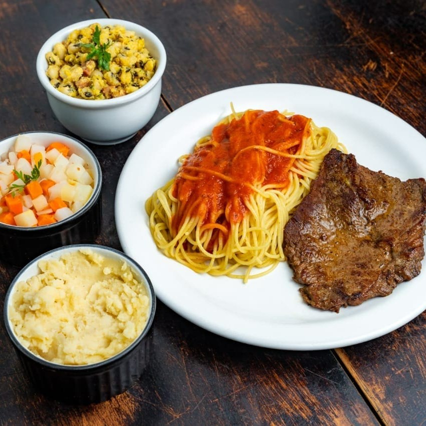 Filé mignon, filé de frango ou filé de alcatra. Escolha seu molho e acompanhamentos de sua preferência. Serve 1 pessoa.