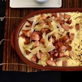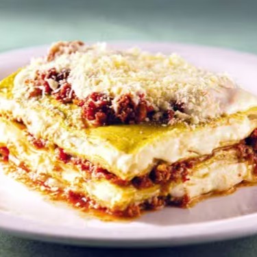 Molho de tomate artesanal, molho branco, carne moída ,queijo e presunto finalizando com parmesão