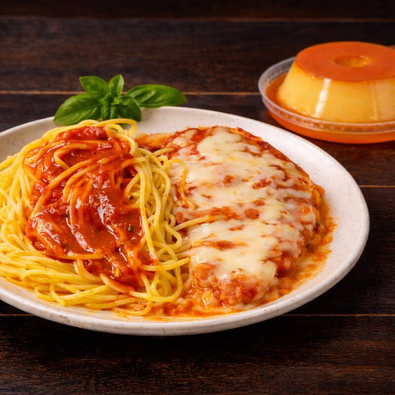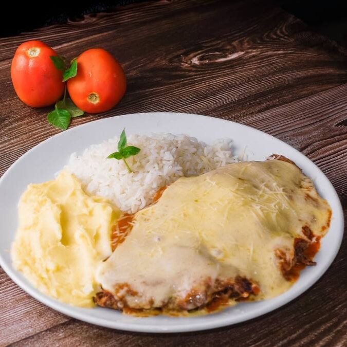 Uma refeição completa e deliciosa: Filé à Parmegiana + Sobremesa.