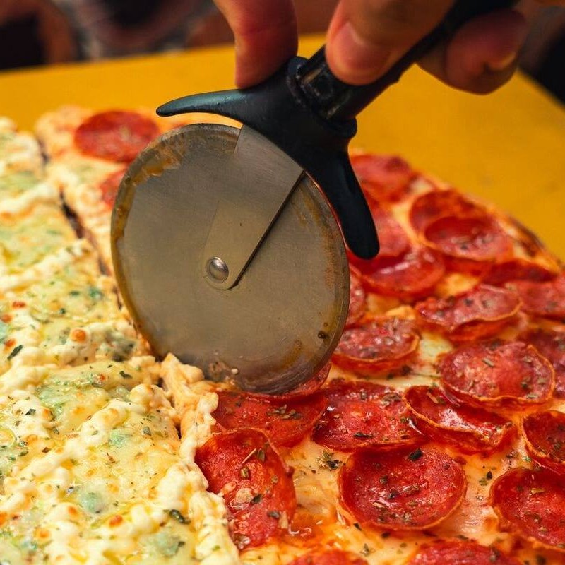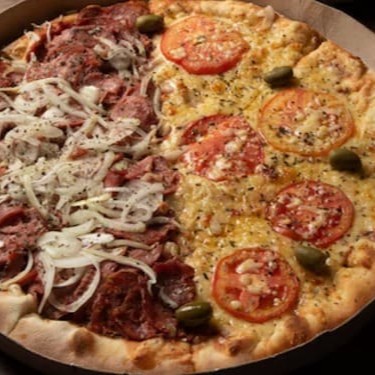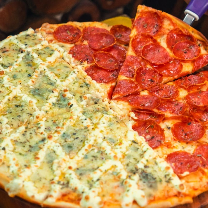 Pizza Grande metade Calabresa (massa artesanal, molho de tomate caseiro, mussarela, calabresa, cebola, finalizado com orégano) + Metade Mussarela (massa artesanal, molho de tomate caseiro, queijo mussarela, azeitona, finalizado com orégano).