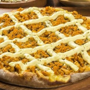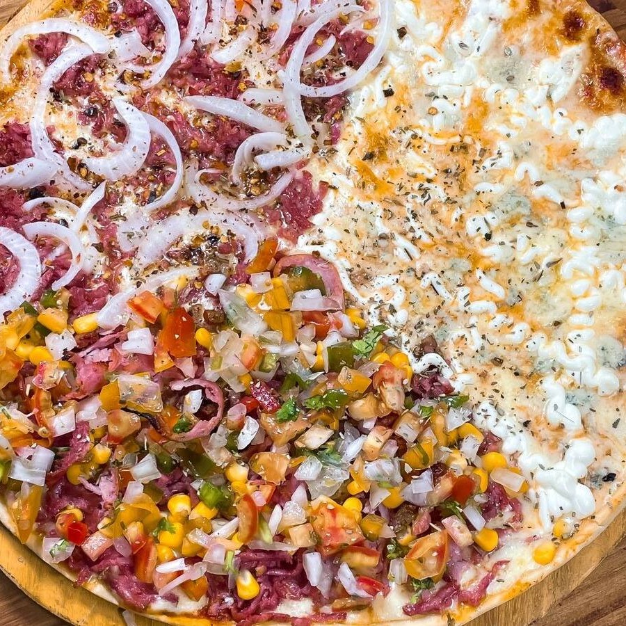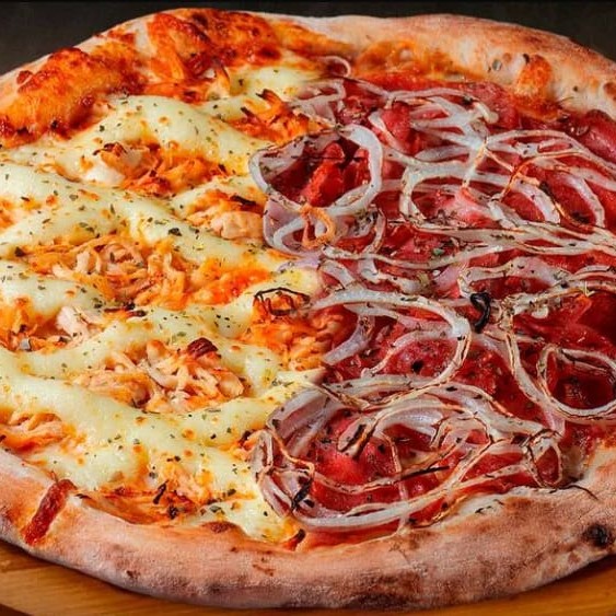 Pizza Grande metade Calabresa (massa artesanal, molho de tomate caseiro, mussarela, calabresa, cebola, finalizado com orégano) + Metade Frango com Catupiry (Massa artesanal, molho de tomate caseiro, queijo mussarela, frango desfiado, Catupiry, finalizado com orégano).