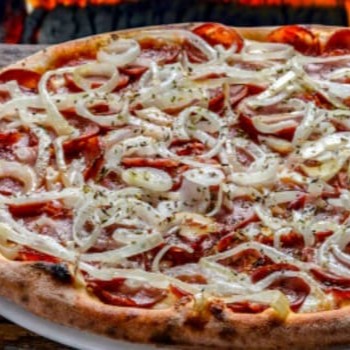 A queridinha de todos: Pizza Grande de Calabresa (massa artesanal, molho de tomate caseiro, mussarela, calabresa, cebola, finalizado com orégano).