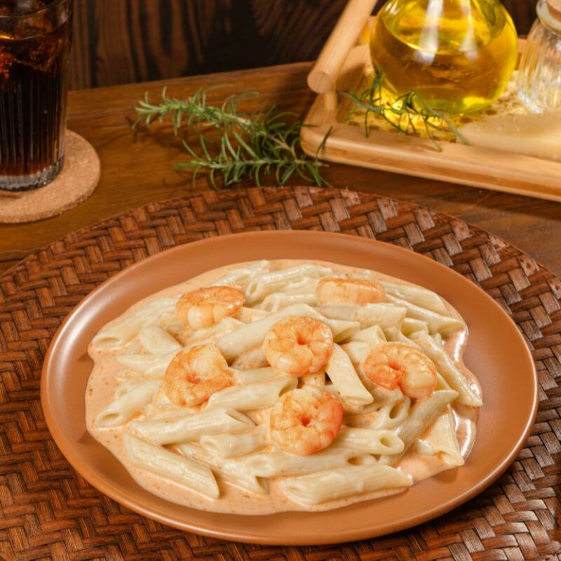 Penne perfeitamente cozido, coberto com um generoso molho de camarão. Esta criação deliciosa e cativante é perfeita para quem aprecia os sabores do mar.