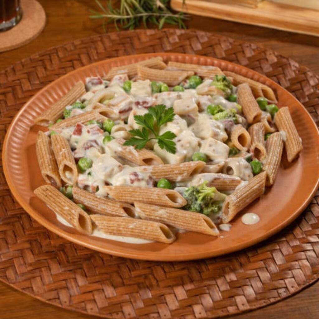 Penne integral coberto com um delicioso molho branco e acompanhado de brócolis frescos, proporcionando uma opção saudável e saborosa para sua refeição.