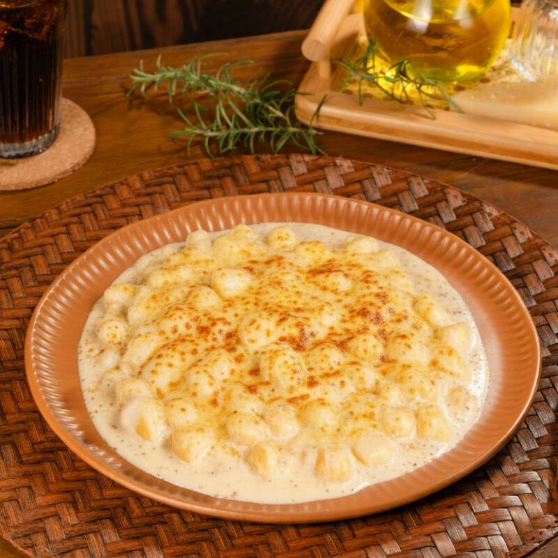 Nhoque de batata suave e saboroso, envolvido em um cremoso molho de três queijos, proporcionando uma combinação inesquecível de sabores e texturas.