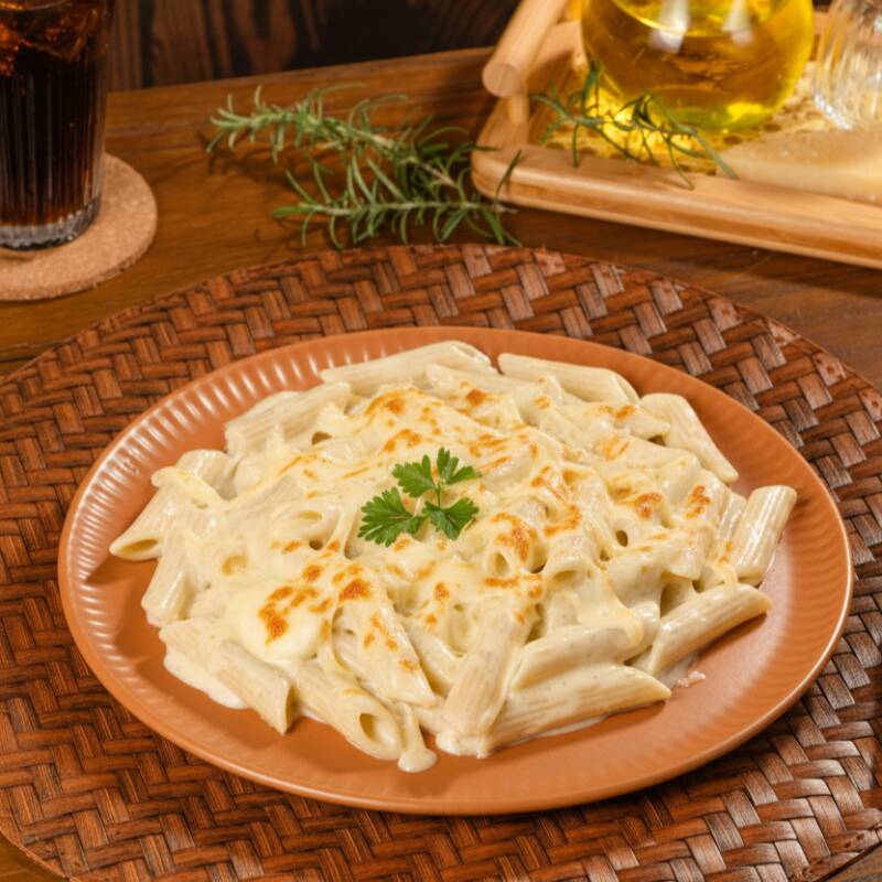 Penne coberto com um irresistível molho de três queijos, feito com muçarela, parmesão e provolone, derretendo na boca e proporcionando uma experiência gastronômica única e deliciosa.