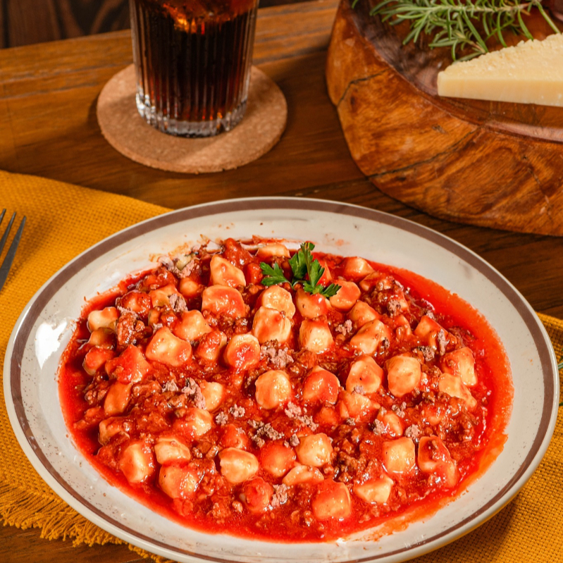 Nhoque de batata macio e delicioso, acompanhado de um autêntico molho bolonhesa italiano, trazendo a tradição e o sabor da Itália.