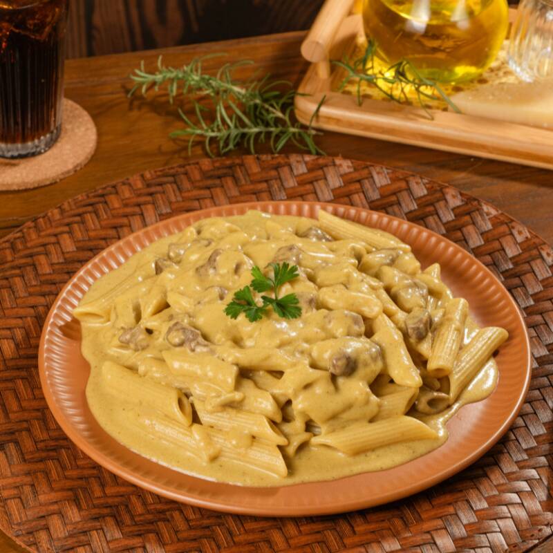 Penne coberto com um delicioso molho feito de carne bovina suculenta e mostarda, proporcionando uma combinação sofisticada e saborosa, perfeita para os amantes da alta gastronomia.