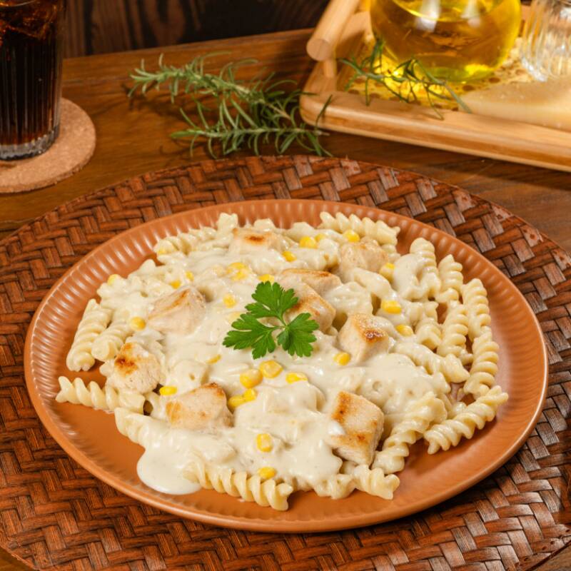 Fusilli perfeitamente cozido, acompanhado de um suculento frango em cubos e envolvido em um delicioso creme de milho, proporcionando uma experiência gastronômica única e irresistível.
