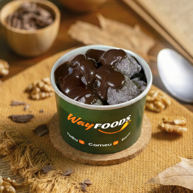 Nhoque delicado e delicioso feito com leite em pó, coberto com uma rica e cremosa ganache de chocolate, proporcionando uma experiência gastronômica doce e irresistível.