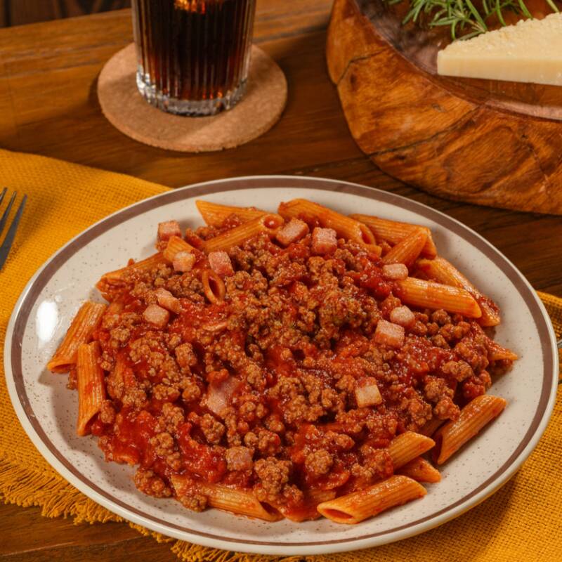 Penne saboroso e cozido à perfeição, acompanhado por um delicioso molho bolonhesa e incrementado com bacon crocante, criando uma mistura irresistível de sabores e texturas.