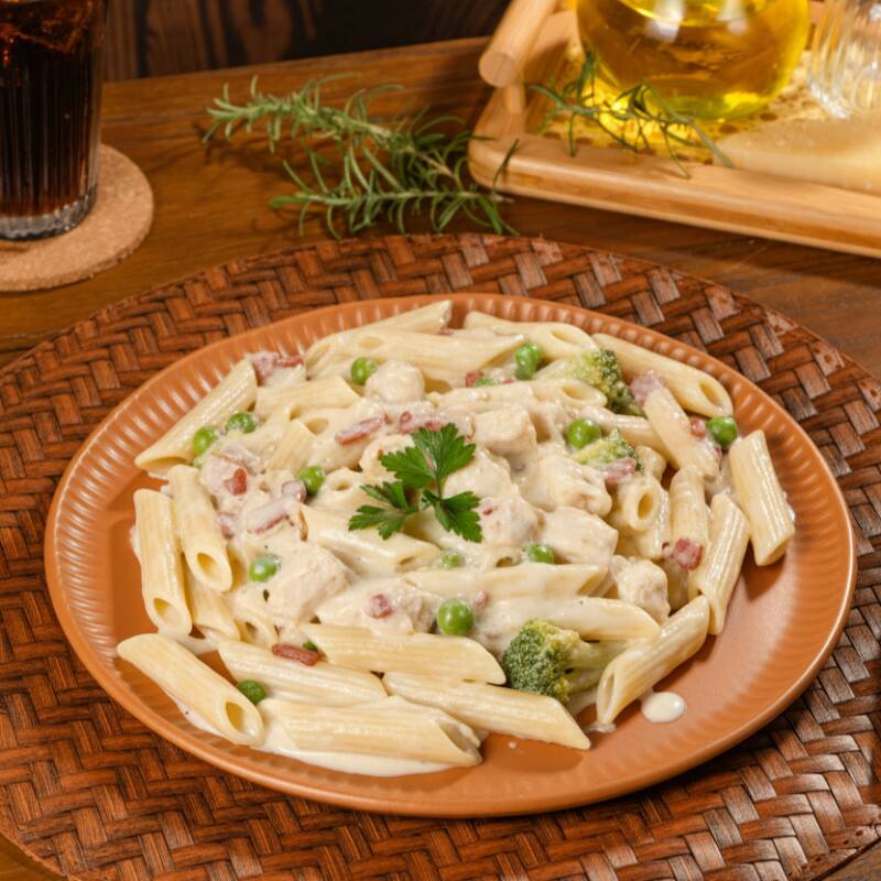 Penne macio e saboroso, coberto com um delicado e suave molho parisiense, feito com frango desfiado, brócolis, bacon e ervilhas, proporcionando uma experiência culinária agradável.