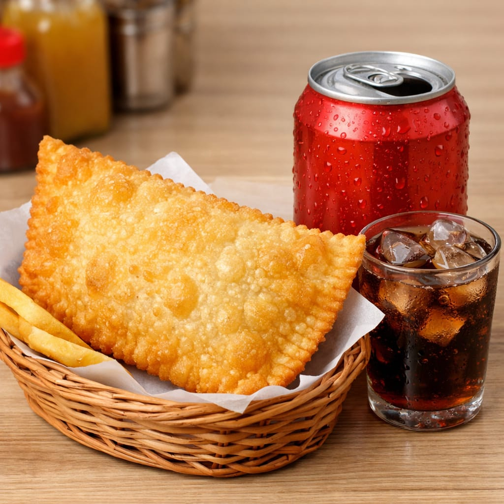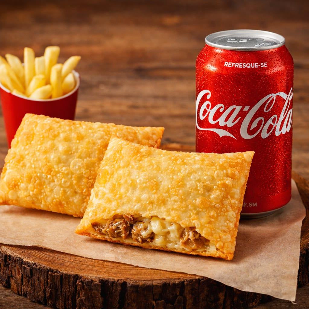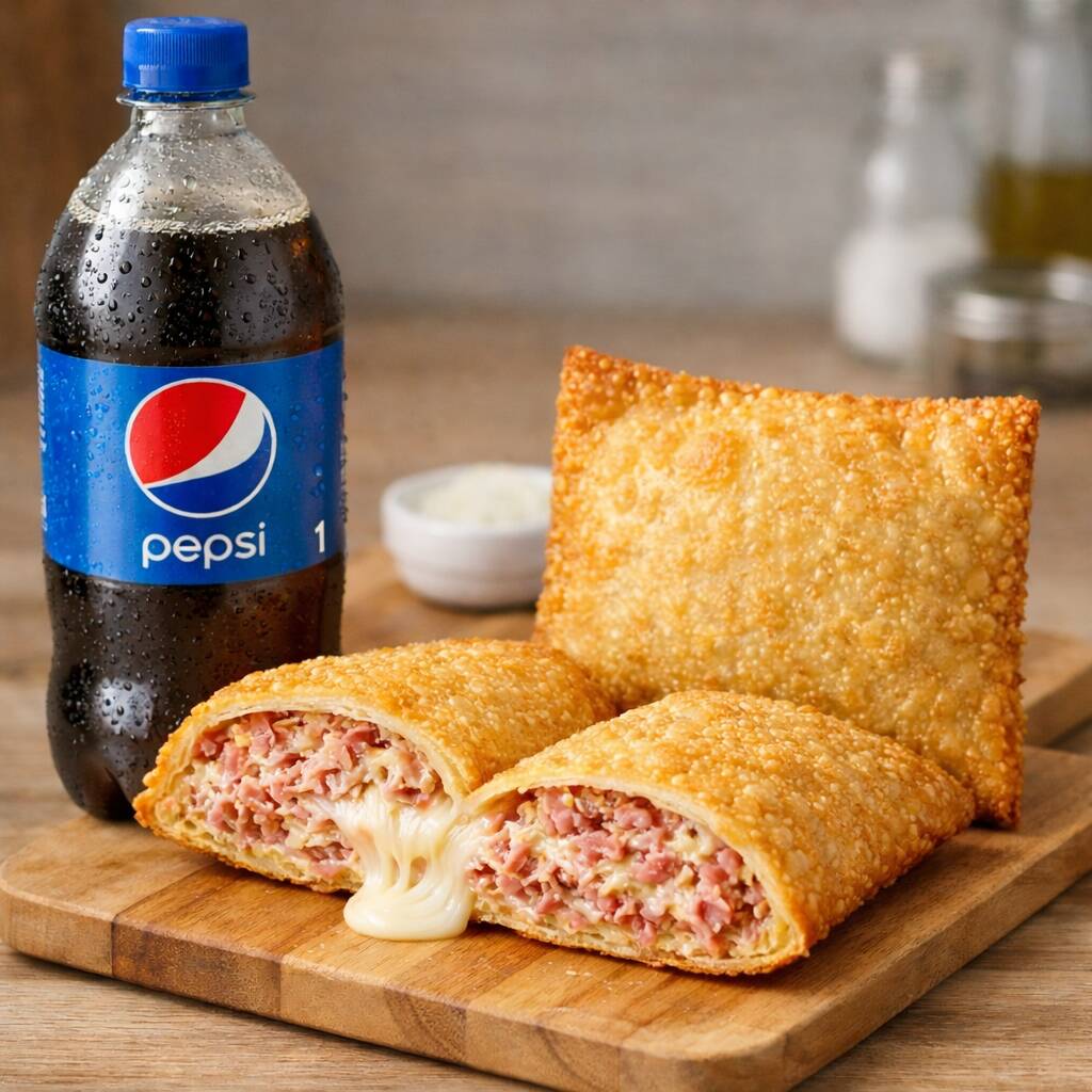 Dois pastéis mistos crocantes, recheados com presunto e queijo derretido, acompanhados de Pepsi 1L bem gelada. Perfeito para dividir ou matar a fome de vez!