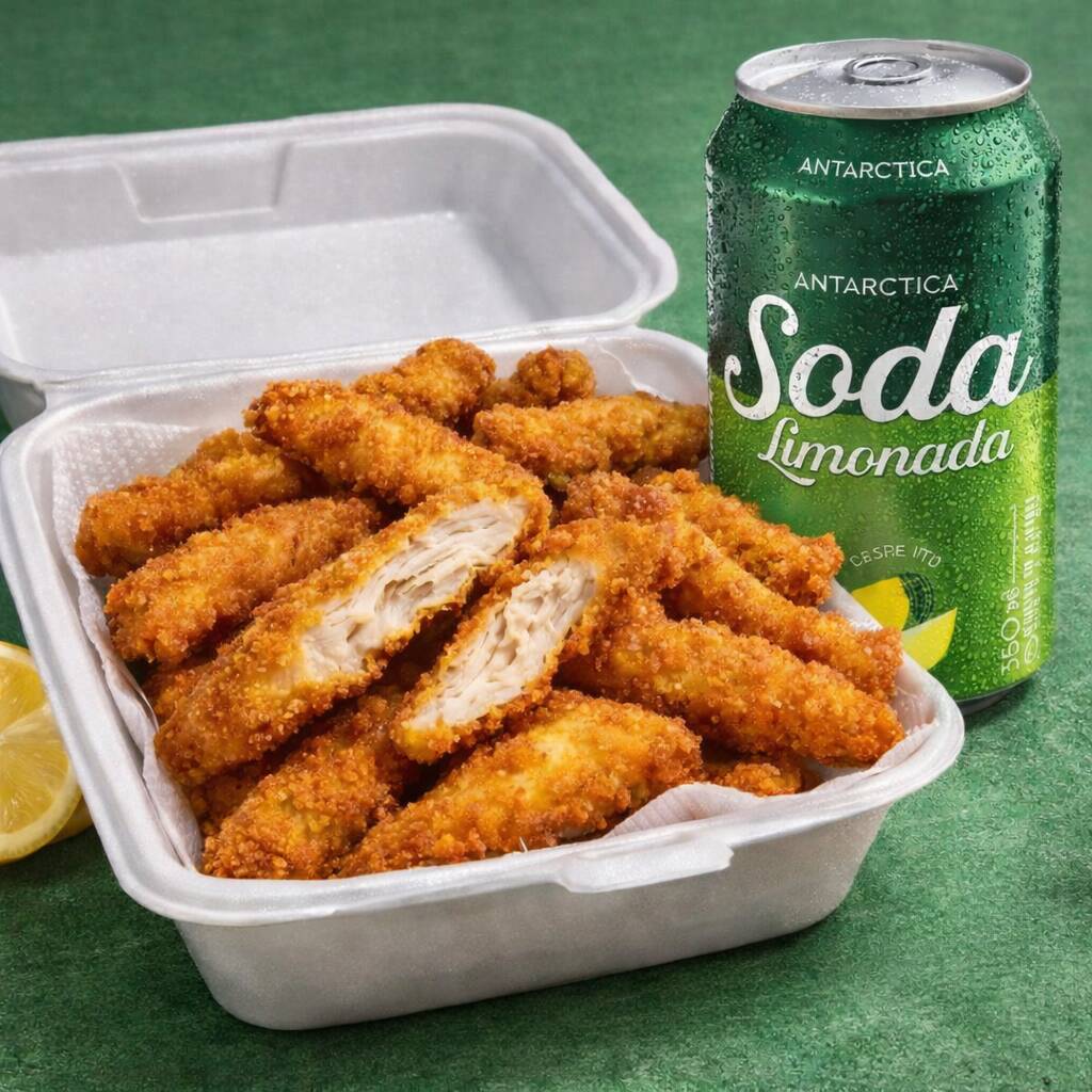 Porção 500g de iscas de frango empanadas, super crocantes por fora e suculentas por dentro, preparadas na hora. Acompanha Soda Limonada refrescante GRÁTIS como brinde para completar seu lanche. Perfeito para quem quer crocância e refrescância no mesmo pedido!