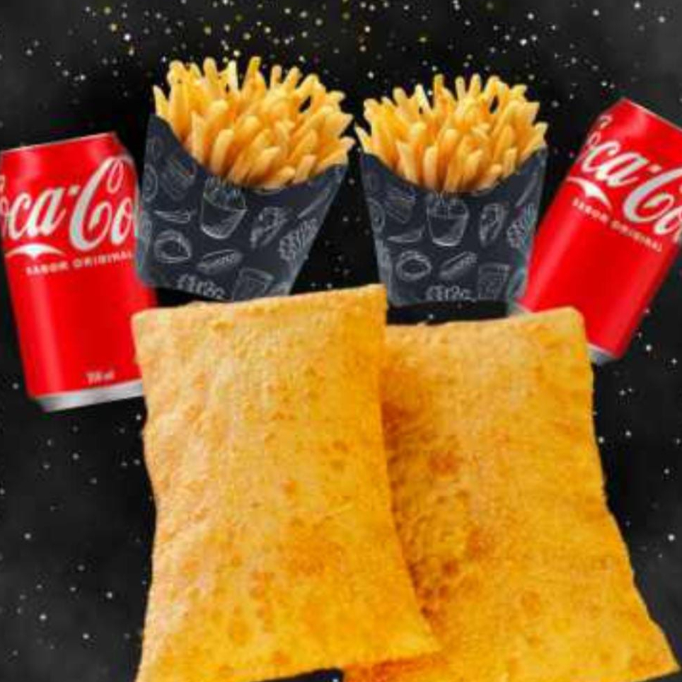 2 pastéis nordestino, 2 batatas fritas tamanho P (pequena) e 2 refrigerantes em lata