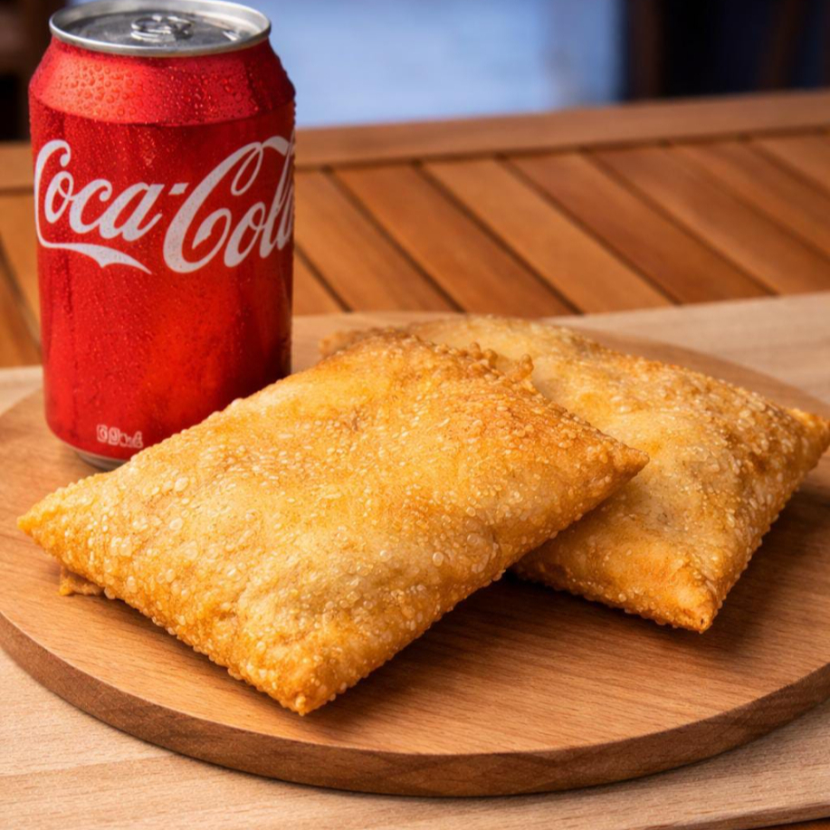 2 pastéis de frango com muçarela e 1 refrigerante em lata