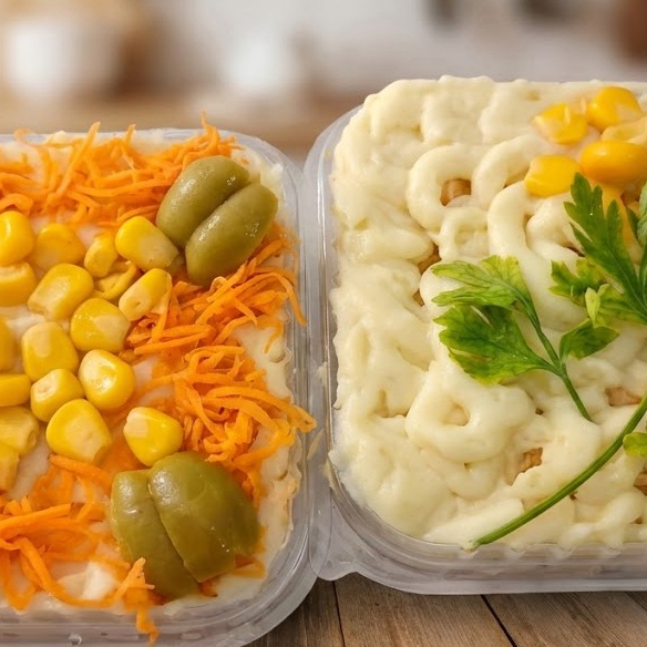 Torta salgada gelada feita com frango desfiado temperado, coberta com purê de batata cremoso. Finalizada com cenoura ralada, milho e azeitona para dar sabor e frescor. Uma opção leve, cremosa e bem temperada, perfeita para qualquer hora do dia.