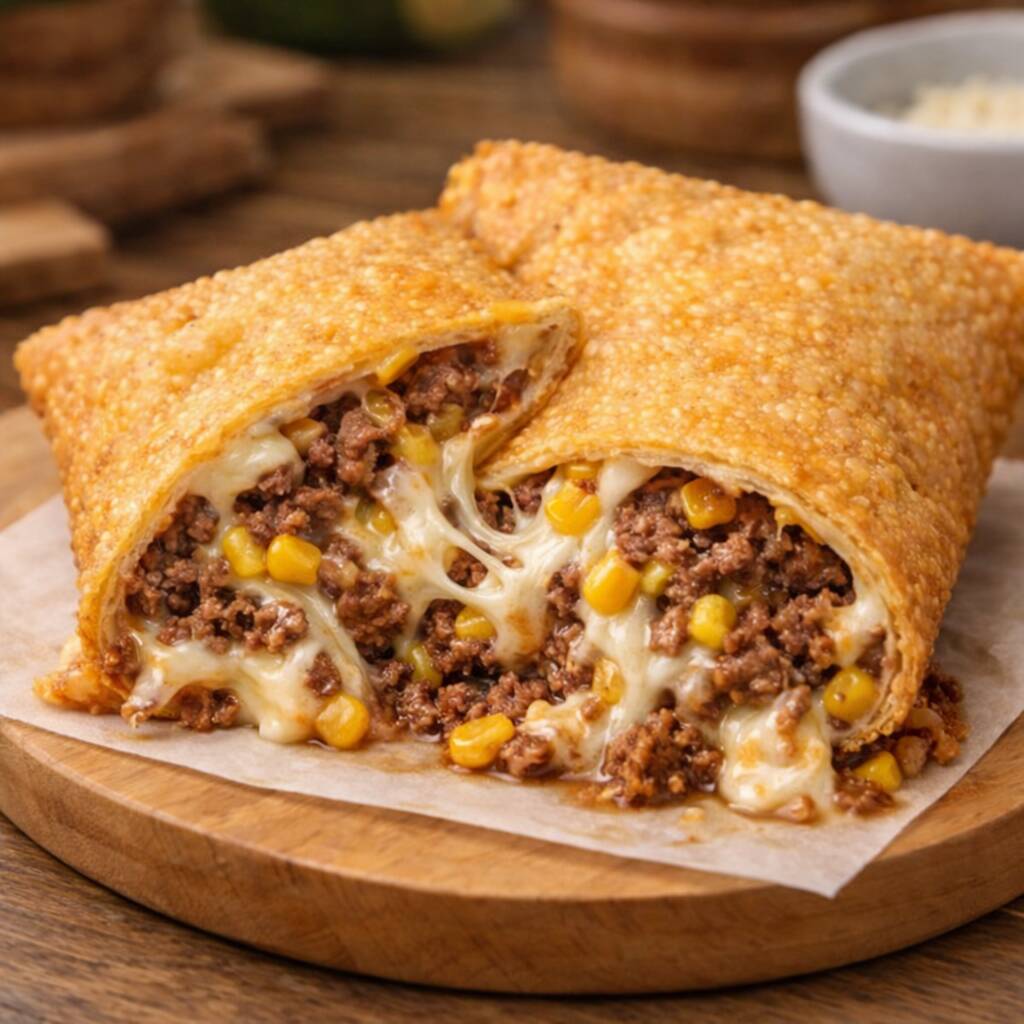 Carne moída selecionada, muçarela e milho