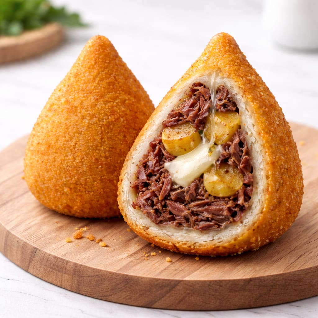 Coxinha artesanal recheada com carne seca desfiada temperada, banana da terra e muçarela derretida