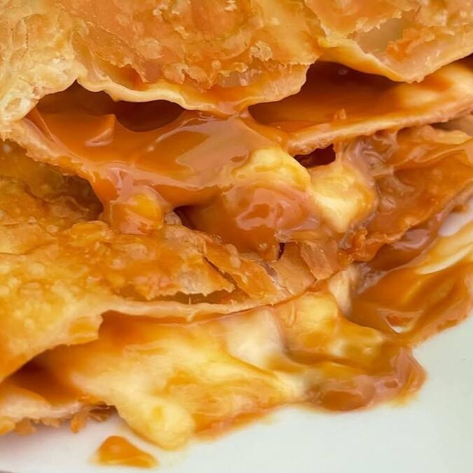 A combinação perfeita do queijo mussarela derretido com o doce de leite caseiro.