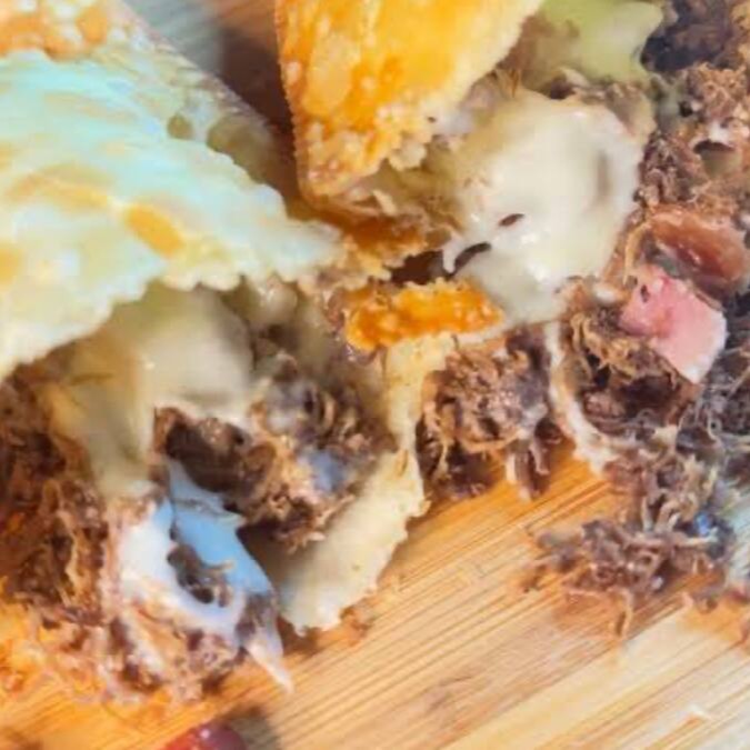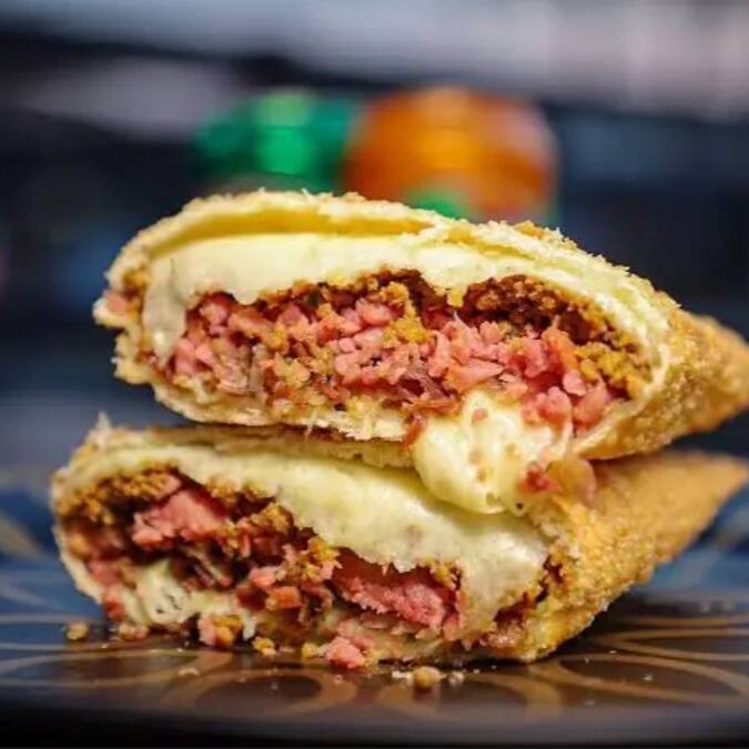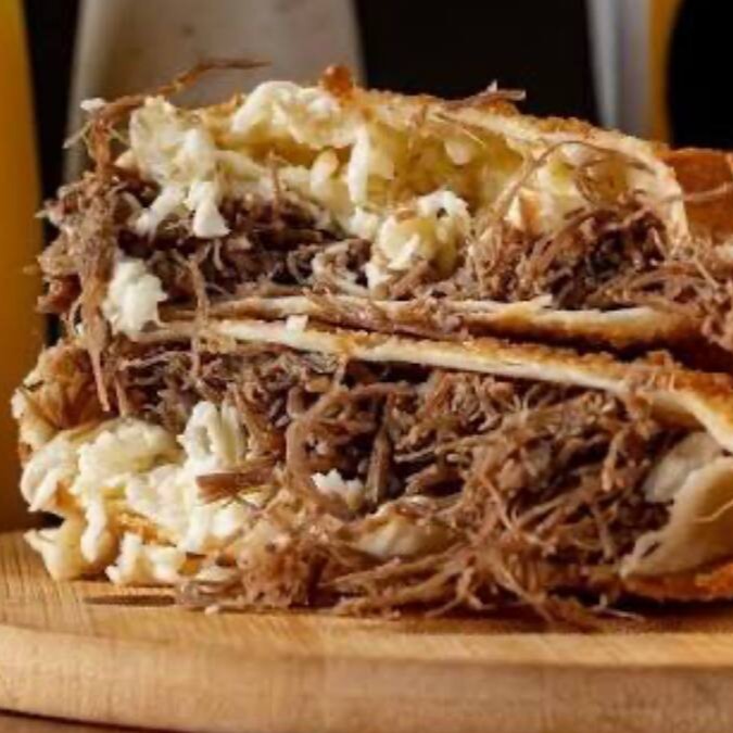 Purê de aipim, carne de sertão frita, cebola frita e queijo mussarela